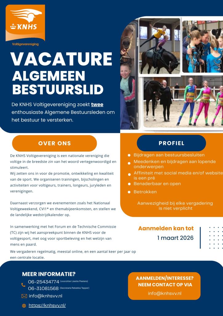 De Algemene Najaarsledenvergadering van de KNHS Voltigevereniging vindt plaats op zaterdag 8 november 2025 bij voltigevereniging d’n Hoef in Lierop.